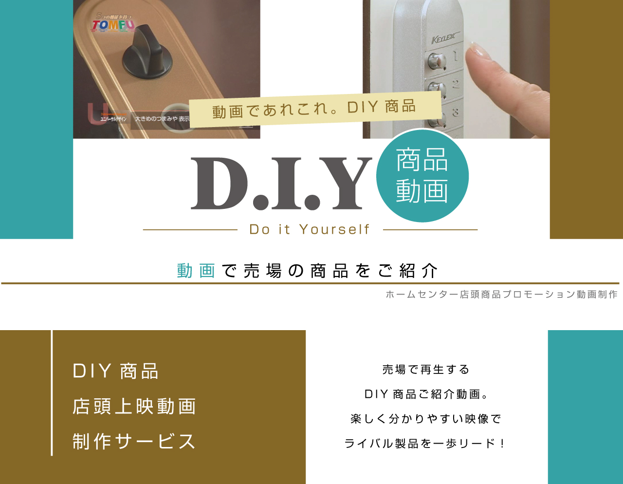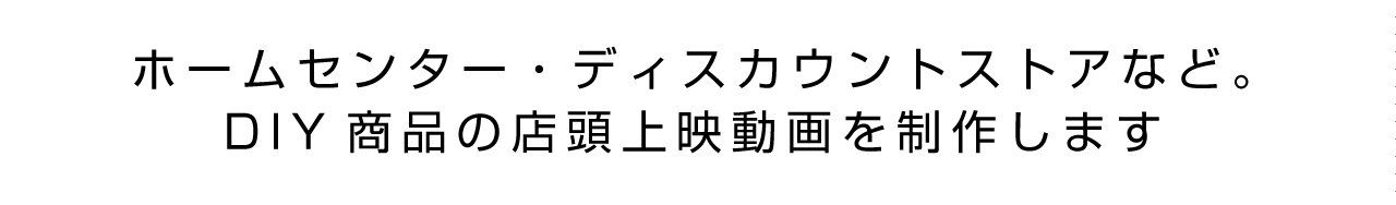 ホームセンターやディスカウントストアの売場で上映するための、DIY商品プロモーション動画の制作をいたします。販売の最前線での動画再生は、拡販に大変効果的。となりのライバル商品に大きな差をつけることができます。特にDIY商品の場合、組み立て方や活用方法など。具体的な映像でご提案することで大きな訴求効果を期待できるもの。売場のお客さまに最後の「ひと押し」を差し上げるために。御社の商品も、動画でプロモーションしてみませんか。