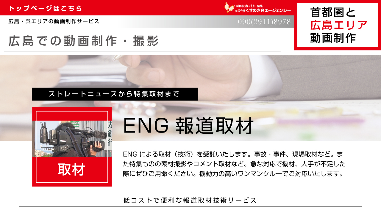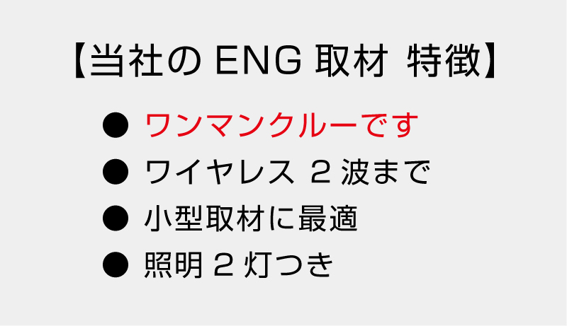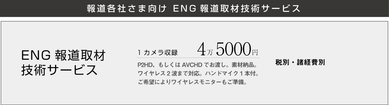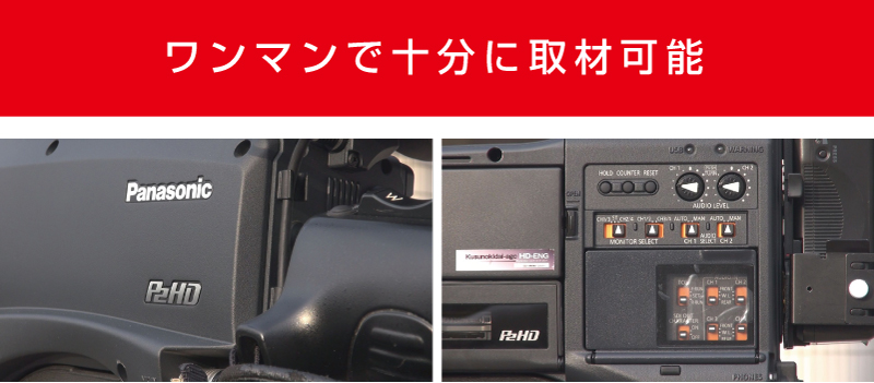 広島エリア 報道取材サービス(1) 報道取材ENG 2020/06/19 当社のENGは「ワンマンクルー」。ワンマンだからこその高い機動力と、卓越した技術でロケをお手伝いします。キー局をはじめとする豊富なオンエア実績も自慢です。 ENGの取材は、P2HDでご対応いたします。取材データは、P2はもちろん、AVCHDでのお渡しも可能。ご都合のよいフォーマットでご納品します ワンマンロケなので、撮影はもちろん音声までしっかりご対応。ワイヤレスは最大2波まで使用可能。ハンドマイクもご用意いたします