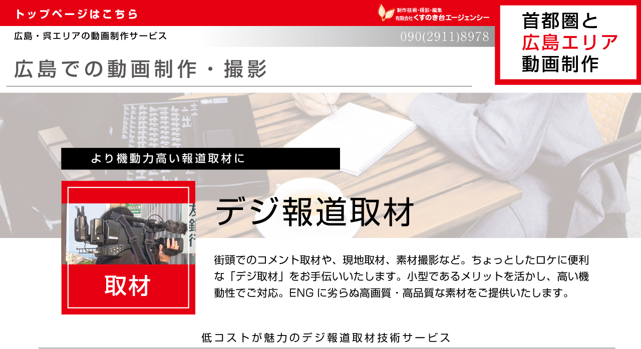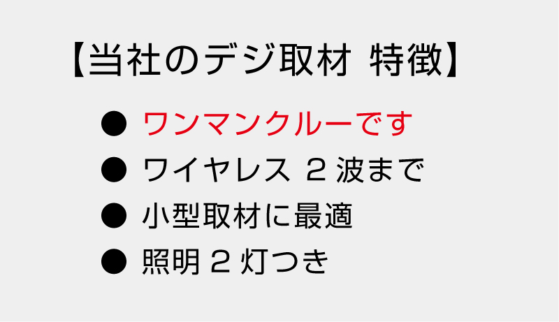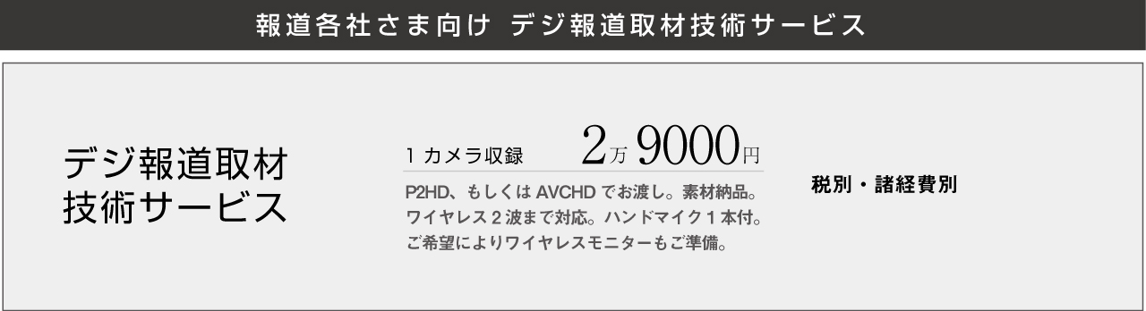 広島エリア 報道取材サービス(2) 報道取材デジ 2020/06/19 当社のデジロケは、低価格が魅力。極端な話、機材をレンタルする感覚でロケ(技術)をご依頼いただけます。周辺機材も豊富に待機しておりますのでご利用ください。 当社のロケは、原則としてP2HD、もしくはDVCPRO-HD収録。ですが、AVCHDでのお渡しも可能です。まずはご相談ください デジロケとはいえ、ワイヤレスにもしっかり対応。ハンドマイクもお持ちしますので、街頭インタビューロケなど便利にご活用いただけます