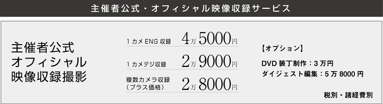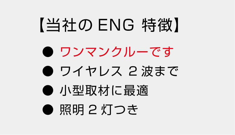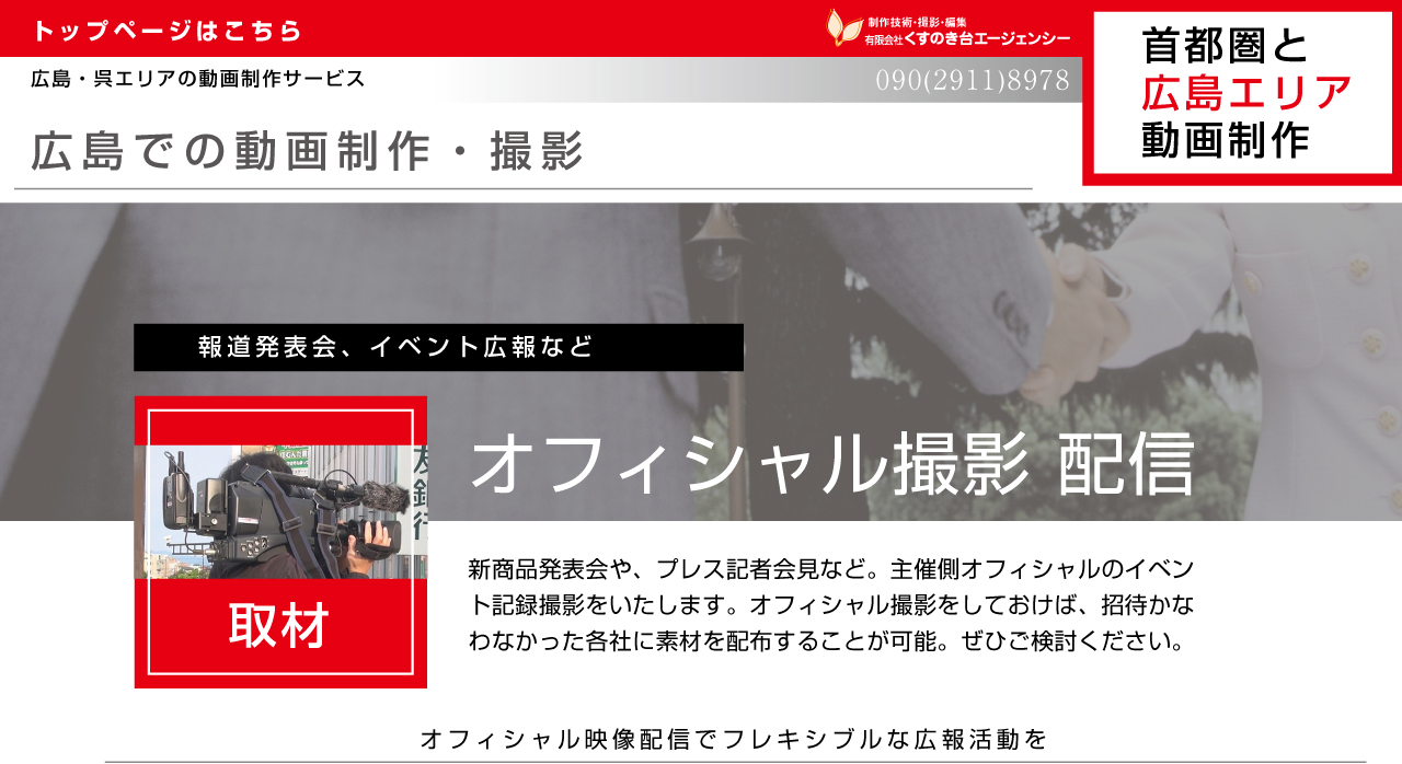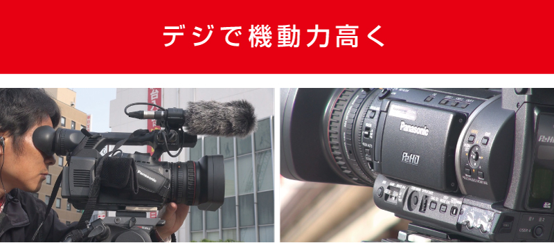 広島エリア 報道取材サービス(3) オフィシャル撮影 2020/06/19 オフィシャル撮影をしておけば、後日の追加広報を行う際にも大変便利。二次使用許可も可能になり、これまで以上に効果的な広報活動が行えるメリットがあります。 オフィシャル撮影は、いわば報道取材のひな形。ご予算に余裕があるなら、ENGでの収録を行いたいもの。報道クルーと同等の収録品質となります ご予算に制約がある場合は、より低価格なデジ撮影をおススメ。ENGに可能な限り肉薄する高品位な撮影が可能です。ワイヤレス収録にも対応