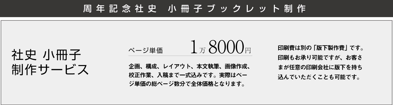 小さく、軽く、かさばらない。しかもビジュアル重視の構成で「見て楽しい・読んで納得」それが小冊子の社史です。御社の周年記念式典用に、ぜひご検討ください。
