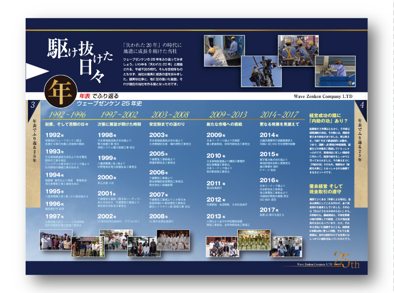 あくまでグラフィックな見せ方を重視。文字も最小限としながら、社史のエッセンスは巧みに凝縮。こうした編集が、今後の社史のトレンドです