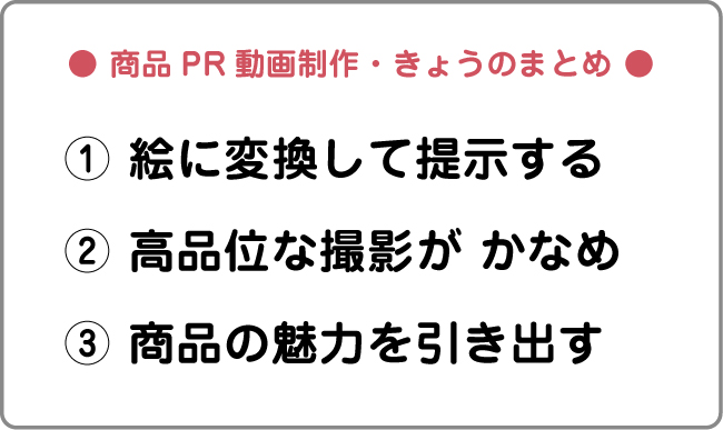 それゆえ、単にモノを見せる、といった形に終始するのではなく、映像の見られ方まで考えた編集を行う。こうしたていねいな進行が商品プロモーション動画制作では重要です。