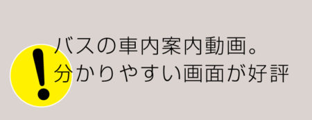 商品プロモーションの動画とは一風違った作例の紹介です。今回は「高速ツアーバス内で再生される、インフォメーション動画」。コンプライアンスや安全対策のため、採用する運輸企業が増え始めています。さっそく見てみましょう。